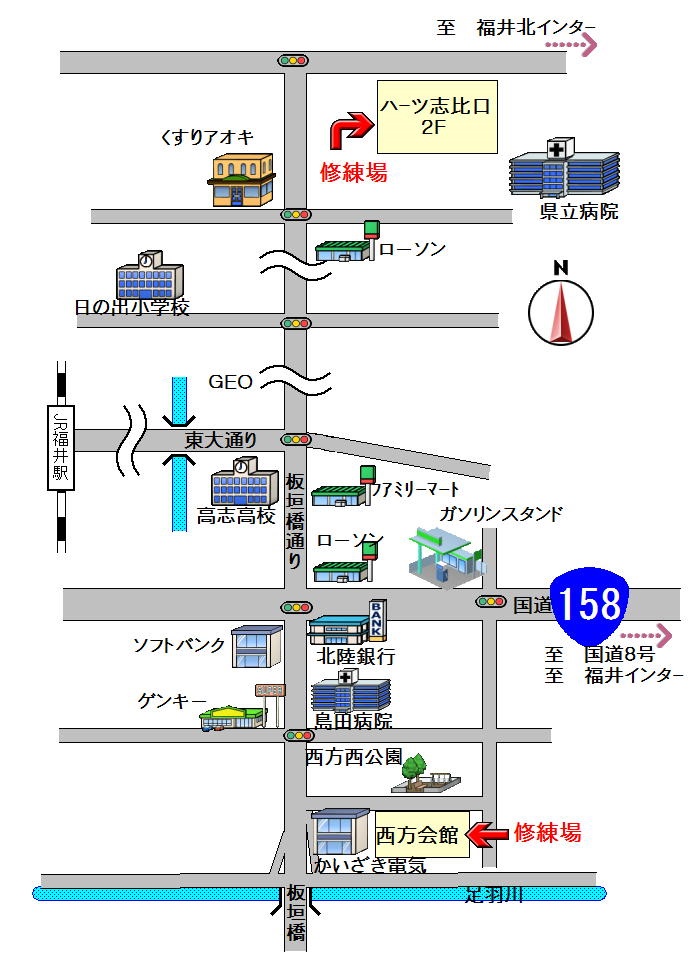 修練場 (火曜日) ハ-ツ志比口2f 福井市志比口2丁目11-13 修練場 (水曜日) 西方会館 福井市西方1-18-8